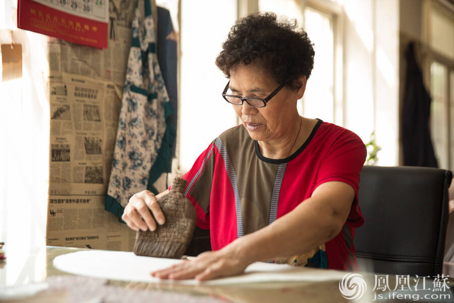 收折。收前用湿手巾简略湿一下,找中间线,再用样板上下对折,折好后,阴干。(文/叶祥兵 摄/郑欢)