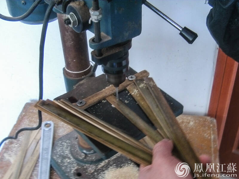 钻眼。将初步处理过的竹条钻眼,准备作为扇骨。(文/叶祥兵 摄/郑欢)