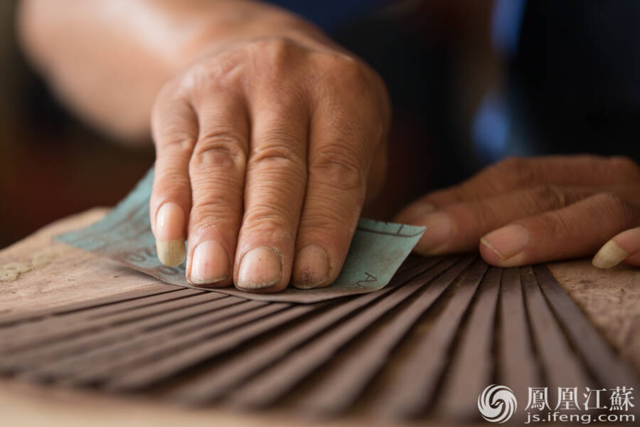 打磨。用砂纸和毛刷打磨提光,使扇骨表面润泽光滑。(文/叶祥兵 摄/郑欢)