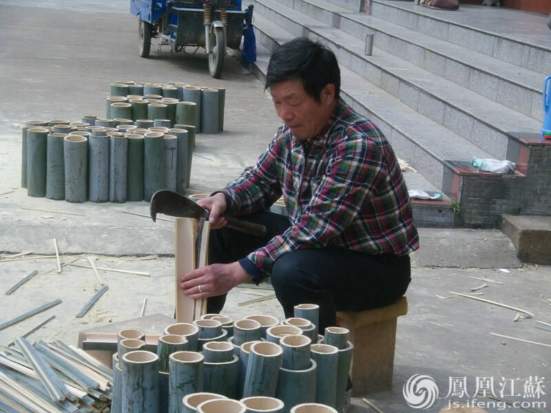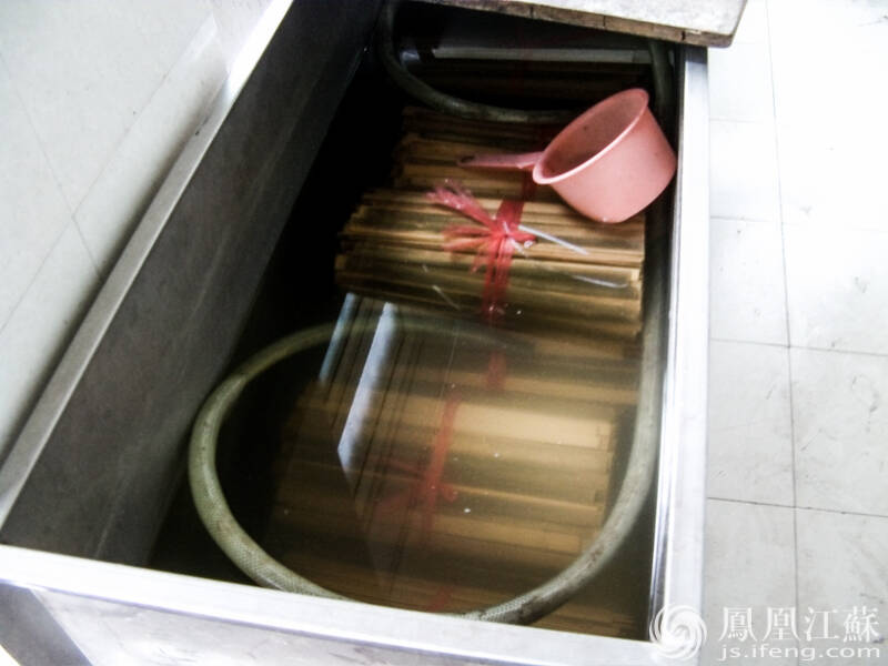 煮料。将劈好的竹条浸泡在水中,使竹子里的蛋白、糖分析出,这样以后才不会生虫。(文/叶祥兵 摄/郑欢)