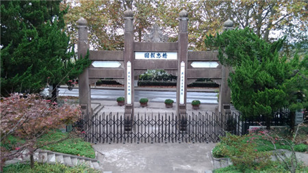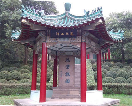 (航空烈士公墓位于南京市紫金山北麓,苍松翠柏环绕,入口处一座亭子内立有石碑,上面刻着孙中山先生的题词:“航空救国” 。)