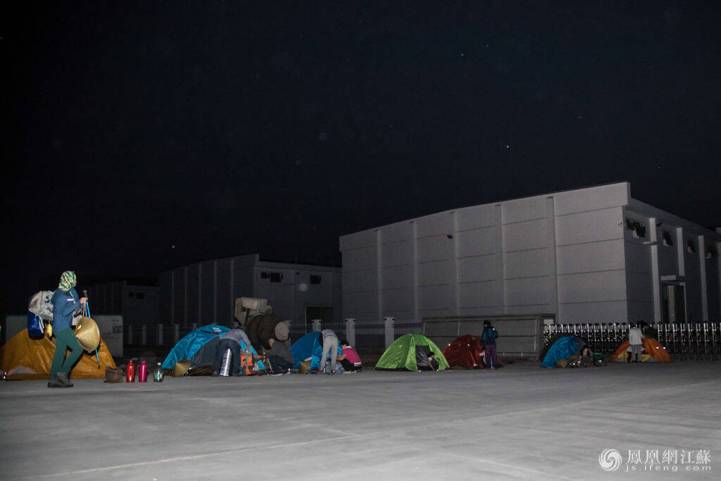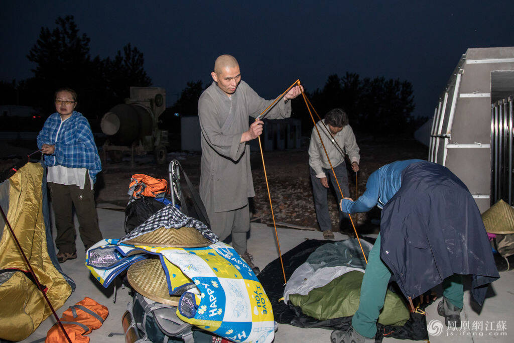 妙求法师选中一处尚在建设中的工厂前宽阔的空地安营扎寨。“能在外面找到平坦的水泥地就很不错了。”妙求法师边指导各人搭帐篷边说,“我小时候生活在农村,夜晚也常常住在空旷的打谷场上。”众人在大门前的水泥地上一列排开,女众靠里,男众靠外,不一会儿就扎好了帐篷。此时,一轮明月已悄然升起。明天天明,他们将继续行程。(文/林景怡 摄/胡潇)