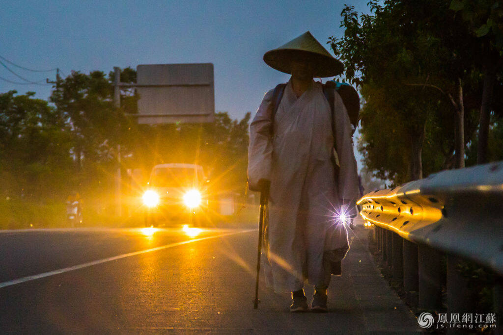 19:00,天色将晚,妙求法师开始物色歇脚的地点。众人行走在薄暮之中,汽车疾驰而过,与他们已有些迟缓的步伐形成了鲜明的对比。行走不便的心智法师此时已在队伍的前方,神态与之前一样恬淡随和,不见一丝痛苦。(文/林景怡 摄/胡潇)
